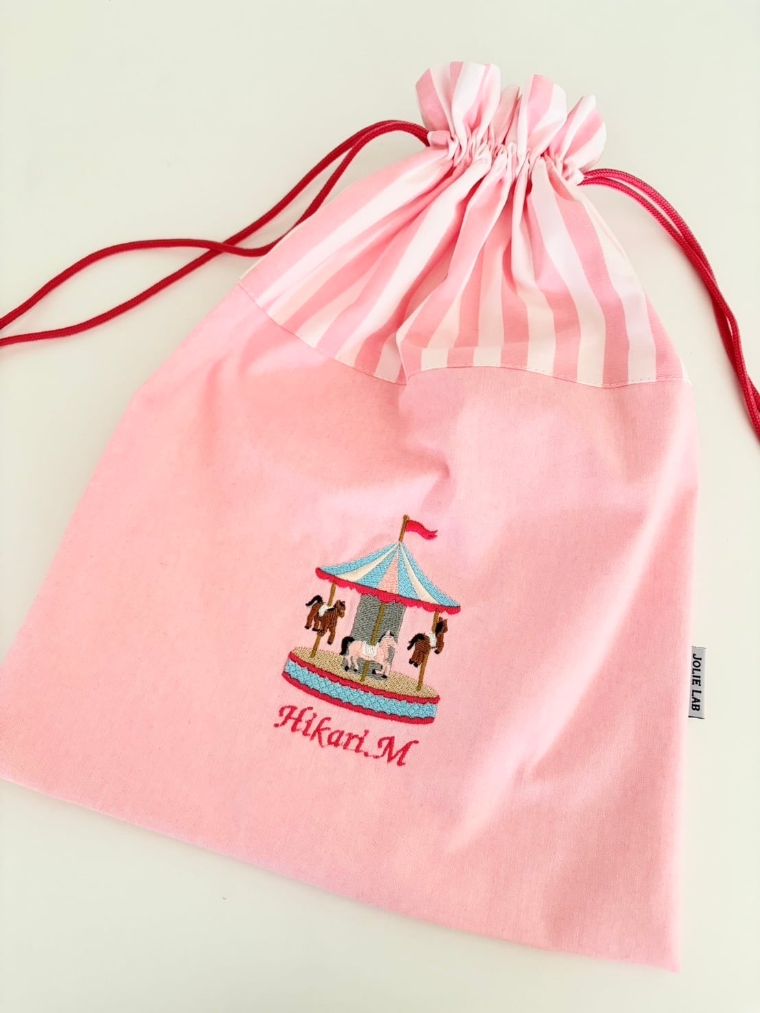 メリーゴーランドの刺繍を施した、巾着ポーチになります。